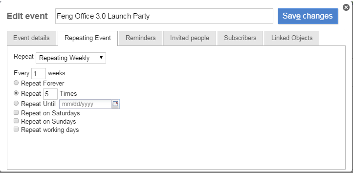- Repeat until: Use this option if you know the last occurrence of a repeating event. Example: If you are planning a weekly meeting for a project which must be completed at the end of the year, enter 31st December.