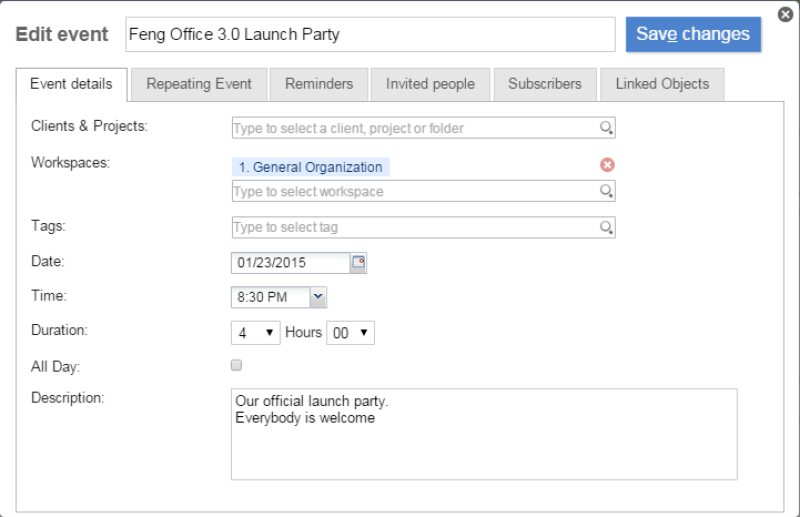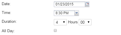 - All Day: If an event has no specific start time and end time, you can set this checkbox. This will deactivate “Time” and “Duration”.