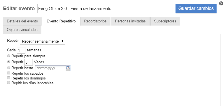- Repetir … veces: Utilice esta opción si conoce exactamente la frecuencia del evento. Ejemplo: Si está planificando un curso de informática que consta de 10 lecciones, es probable que desee definir un evento que se repita 10 veces.