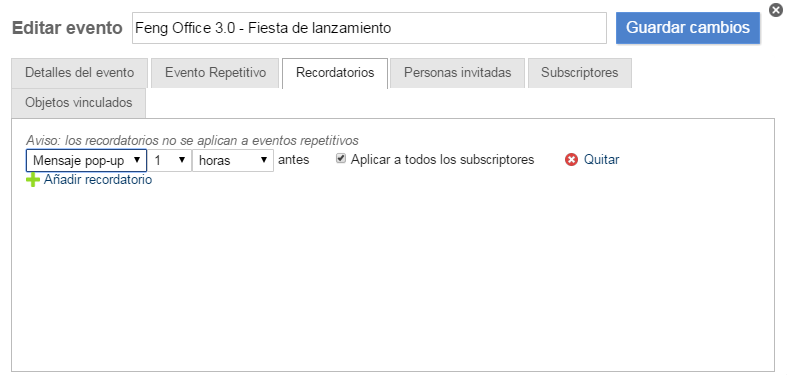 , estos recordatorios no solo se enviarán a las personas invitadas sino también a todos los usuarios subscriptos a este evento. Puede definir tantos recordatorios como desee.