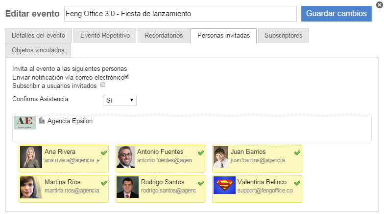 Cuando crea un evento, debe decidir qué usuarios desea invitar. Además, puede elegir enviar invitaciones a través de correo electrónico.