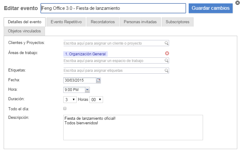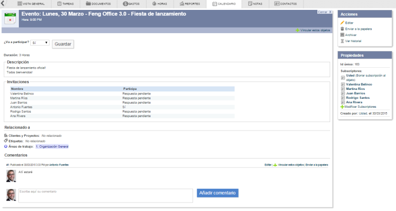 - Subscriptores: Personas subscriptas a este evento. Hacer clic en el nombre de un subscriptor lo redirige al perfil de usuario correspondiente.