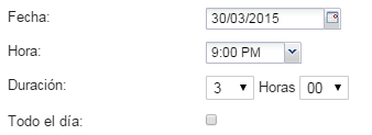 - Fecha: Para ingresar la fecha de un evento, puede utilizar la herramienta de selección de fechas (icono que se encuentra a la derecha del campo de fecha) o puede escribirla directamente (utilice el formato indicado a la derecha del campo de fecha).