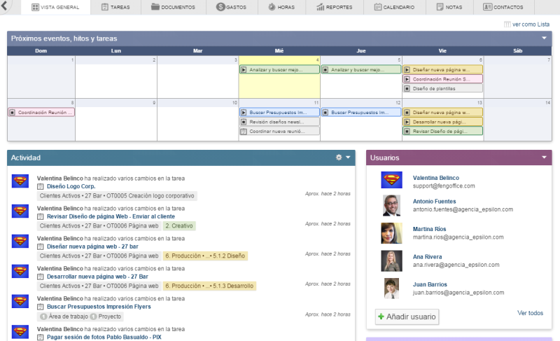 El tablero de instrumentos (que se encuentra en la pestaña general) es la primera pantalla que aparece al iniciar sesión en EVX Software. Le proporciona la información más reciente y más urgente de todos los módulos. Por ejemplo, puede ver de un vistazo las tareas y los hitos que se deban realizar, los mensajes y los comentarios que han sido escritos recientemente, o qué documentos se han subido.