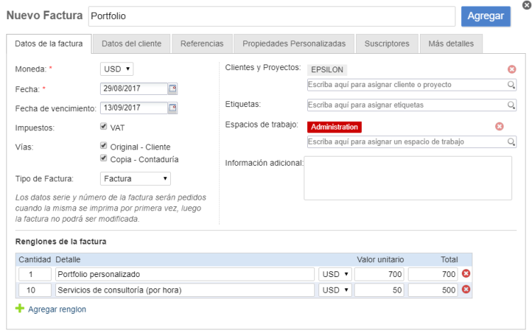 - Clientes y proyectos: puede seleccionarlo a partir de los clientes que ya tiene cargados en el sistema y, al hacer esto, los datos del cliente se cargarán de forma automática