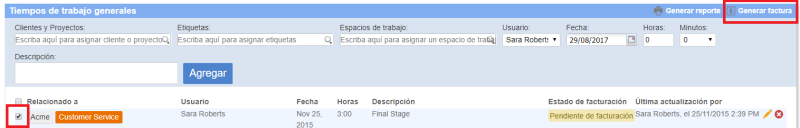 También cuenta con la opción de generar varias facturas a partir de varias tareas con tiempos de trabajo. Esto lo puede hacer seleccionándolas en el listado de tareas y haciendo clic en “Generar factura” en la barra de herramientas.
