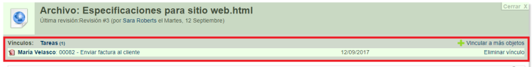 Ahora, cada vez que acceda a la tarea, podrá acceder rápidamente al documento vinculado simplemente haciendo clic sobre el mismo. Y vice versa, el enlace también se ha creado desde el documento hacia la tarea: