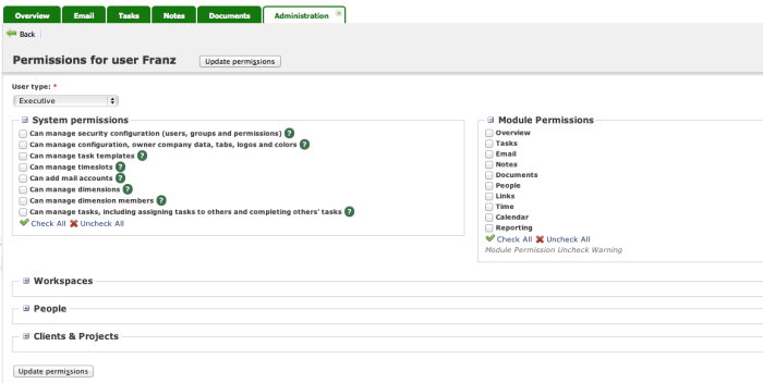 Los permisos por módulos definen si un usuario puede acceder a un módulo especifico y si puede acceder a la información gestionada por ese módulo.