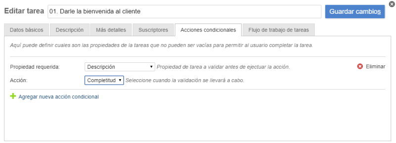 Por otro lado, usted también puede definir condiciones para completar tareas, lo que significa que el sistema no le permitirá a los usuarios completar una tarea si hay campos vacíos. Por ejemplo, una tarea no se podrá completar si no tiene descripción, o cualquier otro campo que seleccione.