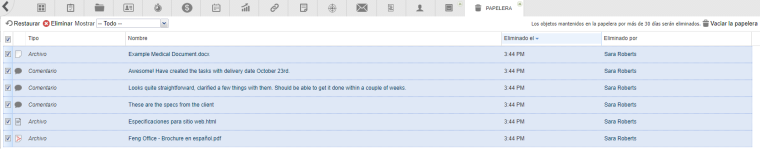 - Cuando se borra un área de trabajo, cliente, proyecto, etc, no se dirige a la papelera. Todos los elementos se borran de forma permanente.