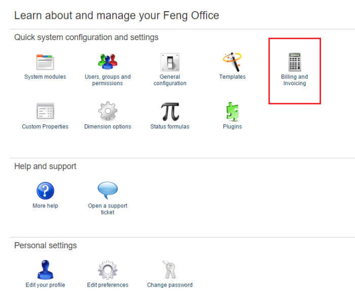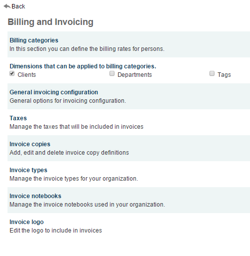 In case you would like to use billing with tasks or with the Time module, you must first create billing categories and assign them to the users.