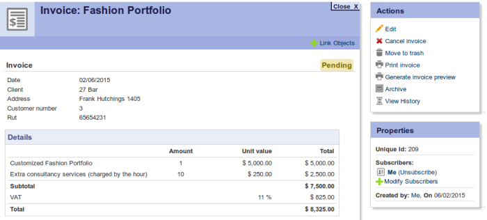 - Invoice line: for the description of the invoice as including the Amount, Details, Unit Value, and Total