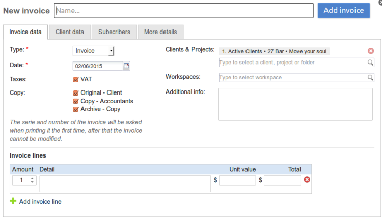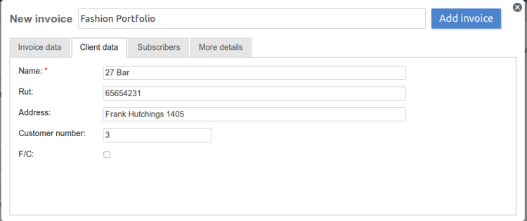 - Client: You can pick it from the clients you have already added, and, by doing so, the Client Data will be automatically loaded