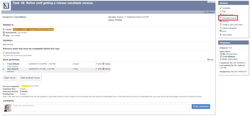 You can also generate Invoices from timeslots inside tasks. For this, you just need to click on “Generate Invoice” on the task´s actions menu, as shown above.