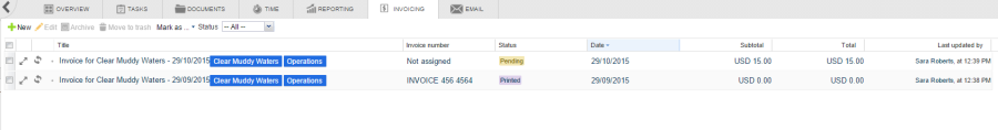 After the invoice has been added, you can access it from the list view, where you can even filter them by their statuses, such as: