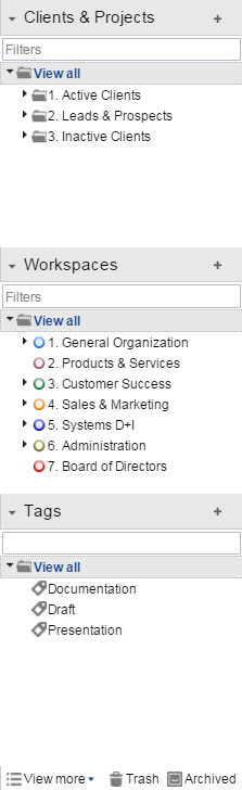 Please note that you can move the divider between the clients & projects, workspaces, and the tags section to your needs. If you need more space on your screen, you can always hide the tags box or even the whole left sidebar by clicking on the arrow buttons.