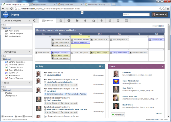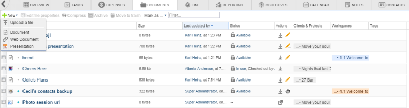- The content panel: With tabs and toolbars for each module (Tasks, E-mail, Documents, Calendar, etc.) at the top.