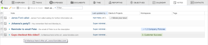 [ Notes | Emails | Contacts | Calendar | Documents | Tasks | Web Links | Time | Reporting ]