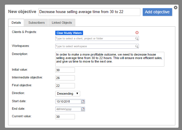 - Clients and projects: Here, you can define the Client or Project that the new objective will belong to.