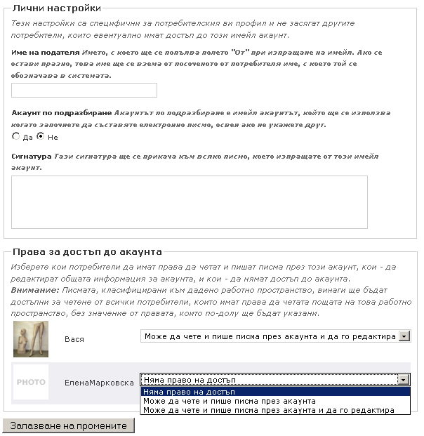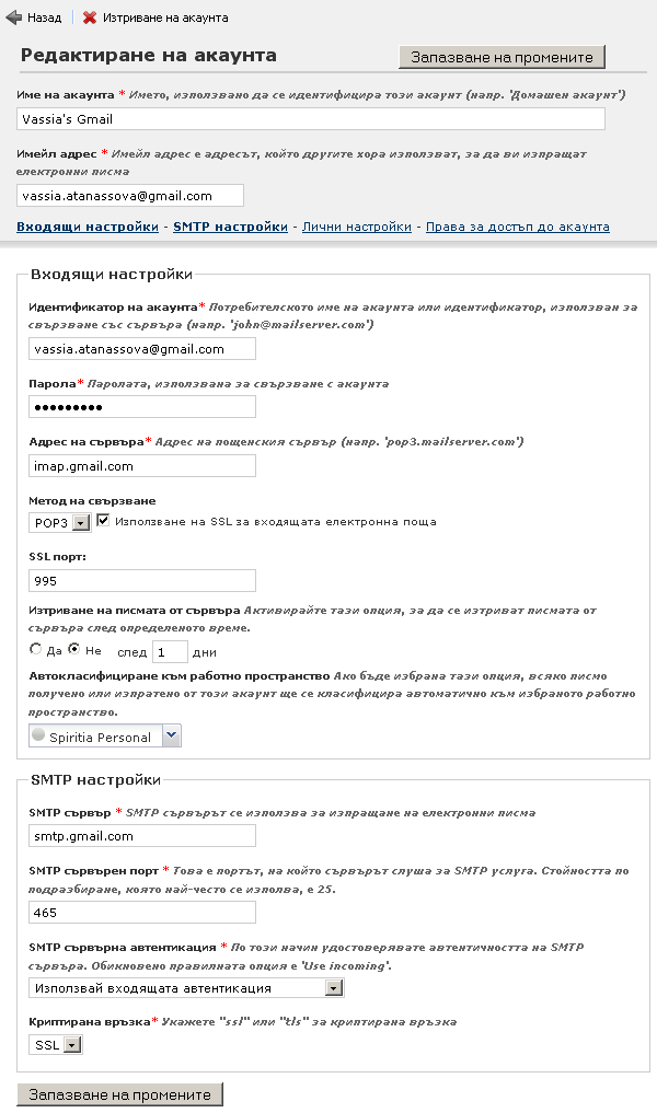 Освен входящите настройки и SMTP настройките има и две допълнителни възможности за настройка на имейл акаунта:
