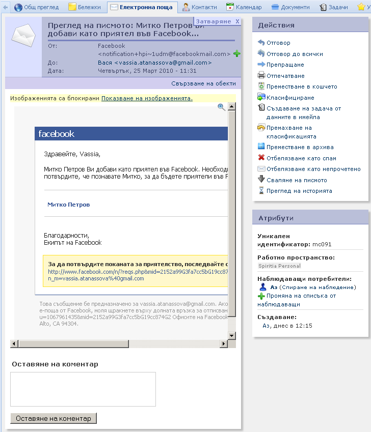 Когато електронно писмо с прикачен файл се асоциира с дадено работно пространство, прикаченият файл се появява в модул ''Документи'' на това работно пространство.