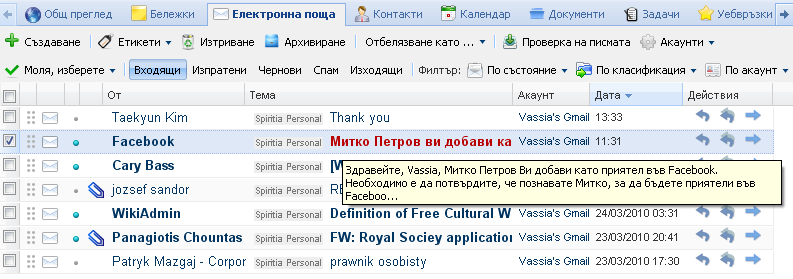 В примера са настроени да се визуализират само колони “От”, “Тема”, “Акаунт”, “Дата” и “Действия”. Освен тях в началото на ред може да се появи иконката в случай, че към писмото има прикачени един или повече файлове.