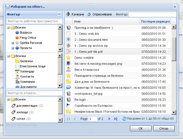 По подразбиране, в него ще видите всички обекти, до които имате достъп. Можете да изберете обект директно (щракайки два пъти върху него в дясната колона) или да филтрирате списъка, като приложите някой от филтрите в лявата колона (по работно пространство, по тип, по етикет).