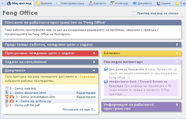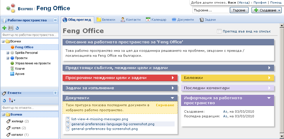 Лявата странична лента предлага два различни метода за филтриране на информацията, която е показана в основната площ на екрана. Тези два метода са работните пространства и етикетите.