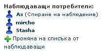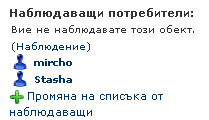 Наблюдението и отказът от наблюдение са прости действия, при които се щрака върху съответната връзка в детайлния прегледн на обекта. На следващия екранен кадър можете да видите обект, който текущо се наблюдава от двама души: