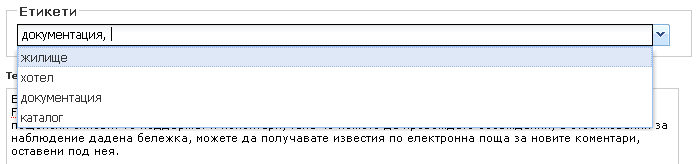 Добяването на етикет става, като просто се изписва името му в съответното поле. За да добавите повече от един етикет, използвайте запетайки за разделители. Докато изписвате името на етикета, ще забележите, че се появява подсказка под формата на падащо меню, която ви предлага измежду съществуващите етикети, започващи с буквите, които вече сте написали. По този начин добавянето на етикети става по-бързо.