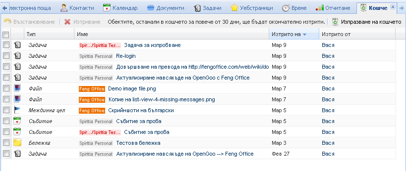 Внимание: Обектите, оставени в кошчето за повече от 30 дни, биват автоматично унищожавани.