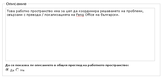 Това е описанието на работното пространство, което може да бъде визуализирано на информационното табло. За тази цел на въпроса Да се показва ли описанието в общия преглед на работното пространство?