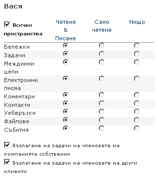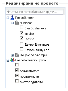В момента, в който изберете някой от потребителите, изгледът се разширява с възможността да зададете подробно различните права за достъп на този потребител: