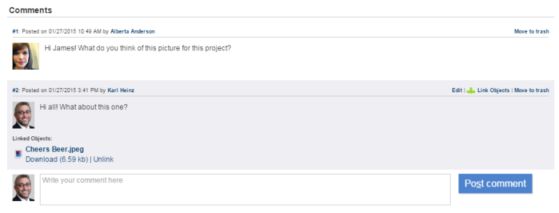 You can see the name and the photo (if available) of the author of each comment. For your own comments, you have the possibility to edit or even send the comment to the trash, and you can link the comment to another object (see Linking objects).