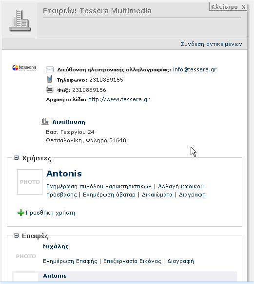 Μια εταιρεία μπορεί να έχει τους χρήστες και τις επαφές που της έχουν ανατεθεί. Κατά την προβολή λεπτομερειών της εταιρείας μπορείτε να δείτε, να επεξεργαστείτε και να δημιουργήσετε τέτοιυς χρήστες και επαφές. (Παρακαλώ σιγουρέψτε ότι κατανοείτε τη διαφορά μεταξύ χρηστών και επαφών.)