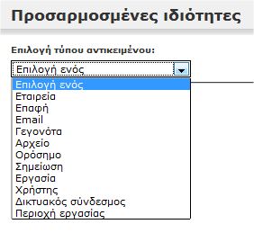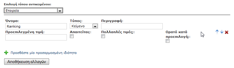 Κάνοντας κλικ στην επιλογή «Προσθέστε μία προσαρμοσμένη ιδιότητα» θα εμφανιστεί μία φόρμα όπως φαίνεται στην εικόνα με τις παρακάτω επιλογές: