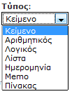 - Τύπος: Ορίζει το τύπο των δεδομένων που θα αποθηκευτούν όπως και τη μορφή του πεδίου που θα εμφανίζεται: