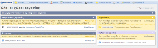 Το dashboard αποτελείται από widgets. Κάθε widget εμφανίζει πληροφορίες από συγκεκριμένη μονάδα ή από συγκεκριμένο τύπο πληροφορίας. Το widget Σημειώσεις