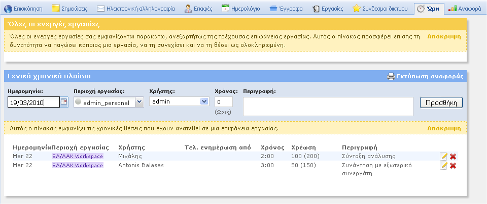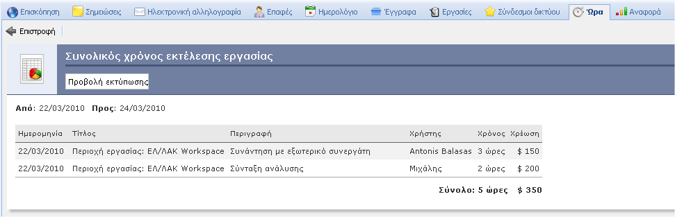 Το εργαλείο της ώρας σας επιτρέπει να καταγράφεται το χρόνο που έχετε ξοδέψει εσείς και οι συνεργάτες σας στις διάφορες εργασίες. Βασιζόμενοι στο κόστος ανά ώρα που έχετε ορίσει στη Διαχείριση μπορείτε να δημιουργήσετε αναφορές που εμφανίζουν το κόστος ανά χρήστη και/ή περιοχή εργασίας εντός συγκεκριμένου χρονικού διαστήματος. Με αυτό το τρόπο είναι εύκολη η κοστολόγηση ενός πελάτη.