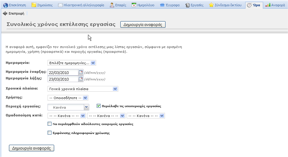 Για να δημιουργήσετε μία αναφορά κάντε κλικ στο σύνδεσμο “Εκτύπωση Αναφοράς” στη πάνω δεξιά γωνία της περιοχής “Γενικά χρονικά πλαίσια”. Έτσι μεταφέρεστε στο φίλτρο για δημιουργία αναφορών χρόνων :