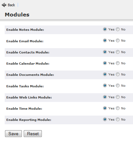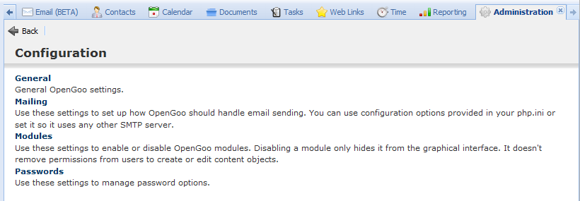 En esta subsección puedes habilitar o deshabilitar cada uno de los módulos de OpenGoo.