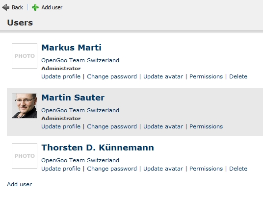 Como excepción a la regla, no puedes borrar tu propia cuenta de usuario; esta característica de seguridad te impide bloquearte a tí mismo y dejarte fuera de la instalación de OpenGoo. De la misma forma, tampoco puedes borrar la cuenta del primer usuario, que suele ser el administrador principal.