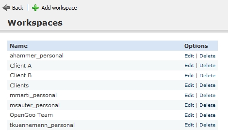 Desde el panel de administración pueden añadirse, editarse y borrarse los espacios o áreas de trabajo. OpenGoo crea automáticamente un área de trabajo personal para todos los usuarios del sistema, que se llama <usuario>_personal