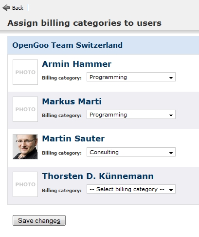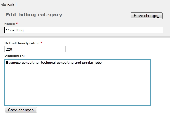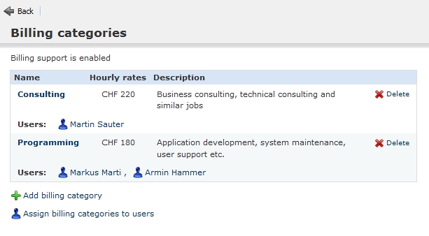 Esta sección del panel de administración te permite gestionar las categorías de facturación. Una categoría de facturación consiste una tasa por hora para cierta función o trabajo, que puede asignarse a uno o más usuarios. Cada usuario individual sólo puede tener una tasa por hora en un momento dado.