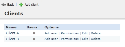 Desde el panel de administración se pueden añadir, editar y borrar clientes, pueden asignarse usuarios a esos clientes y se pueden gestionar sus permisos. Para entender las características de una compañía, por favor mira Trabajar con empresas.