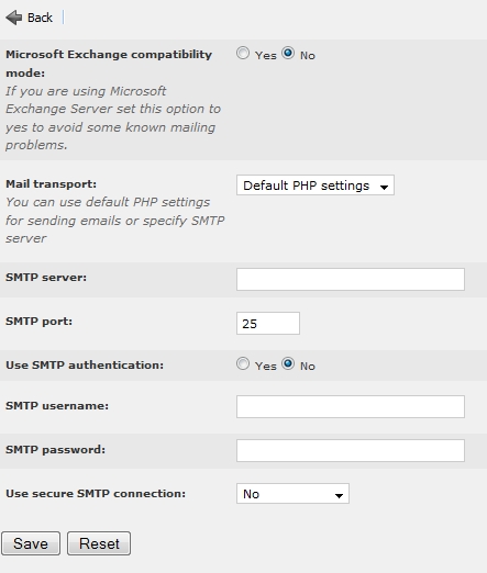 - Transporte de Correo: Te permite escoger el método por el que se envían los correos - por las funciones de correo de PHP (no necesita más configuración), o mediante un servidor SMTP (ver más abajo).