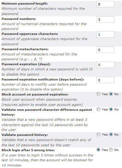 - Expiración de la contraseña (días): Cantidad de días en los cuales la contraseña es válida (0 para deshabilitar esta opción).