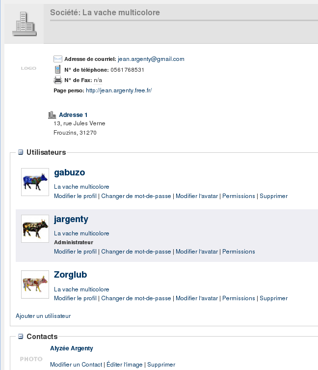 Une entreprise peut avoir des utilisateurs et des contacts qui lui sont assignées. Dans la vue détaillée d'une entreprise, vous pouvez voir, éditer et créer les utilisateurs et les contacts. Assurez-vous que vous faites bien la différence entre les utilisateurs et les contacts.