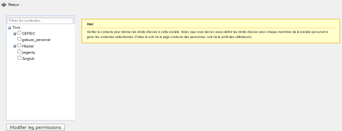 Les permissions des contextes font partie du profil d'utilisateur, mais il y a des permissions relatives à la société également. Pour comprendre ces droits (en particulier leurs relations aux permissions des contextes), lisez la page Comprendre les droits de l'utilisateur.