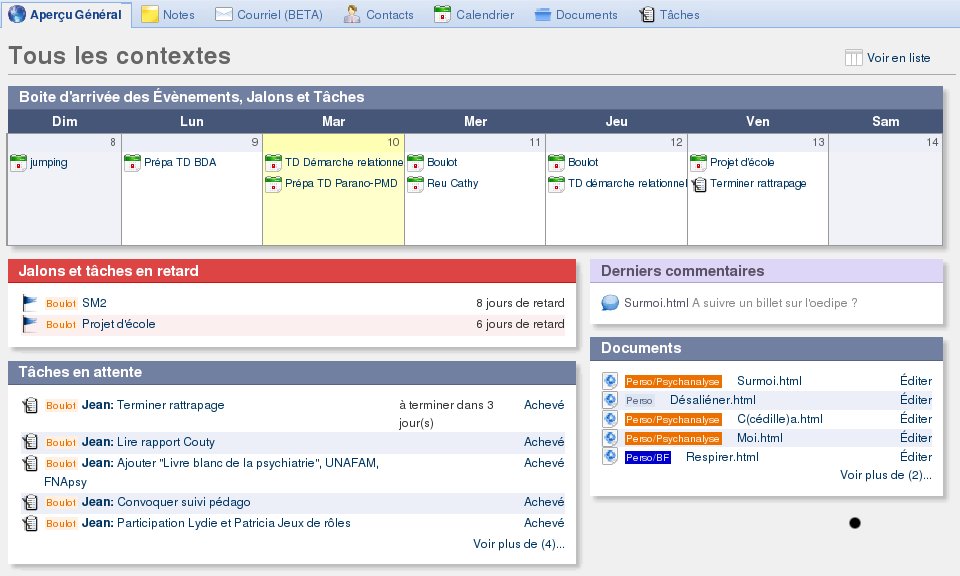 Le tableau de bord est constitués de widgets. Chaque widget présente des informations sur un module spécifique ou sur une catégorie spécifique d'information. Le widget notes par exemple informe des saisies les plus récentes, alors que le widget “dernier commentaires” affiche les commentaires les plus récents de tous les modules. Comme vous pouvez le voir le titre des widgets est éloquent. Remarquez la couleur des widgets - les mêmes que celles des vues détaillées de l'objet correspondant.